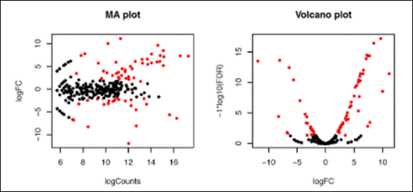 verificar que as contagens com um valor de FDR < 0.5 (os bãos de olhar) estão coloridas de vermelho. Fold change expressa o número de