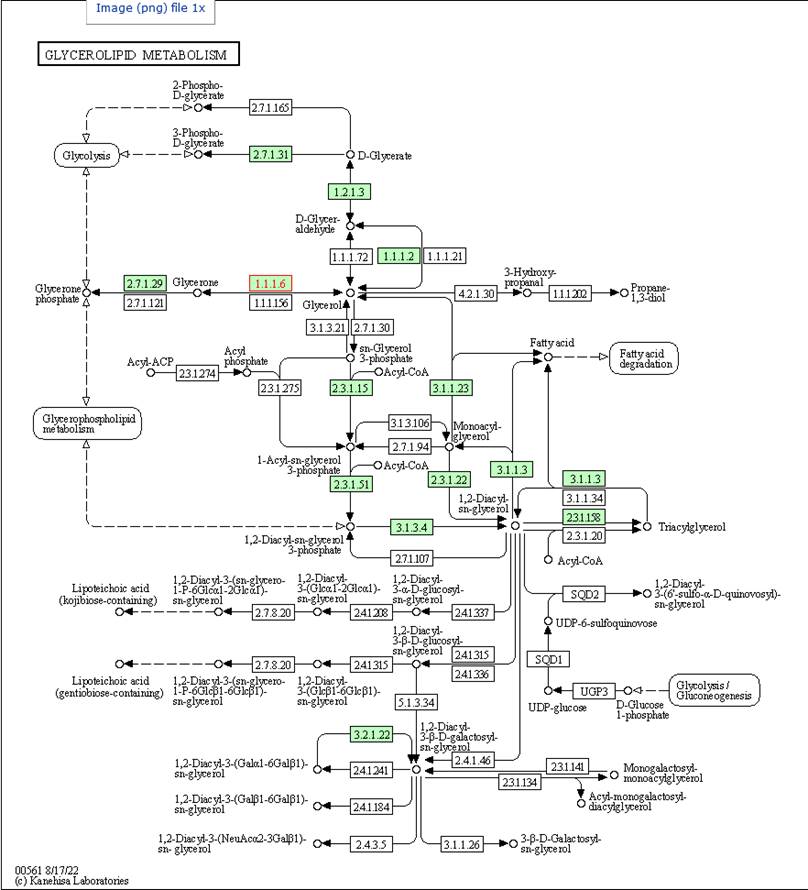Expore as proteínas que têm Pathway: a sexta: SPBP35G2.12; a oitava: SPAC6G9.09c; a nona: SPAC13F5.03c e a décima: SPCC1739.13. Essas todas tem Pathway pra vc olhar e as proteínas vão estar em vermelho nos Pathways! Aqui uma via da nona SPAC13F5.03c uma glycerol dehydrogenase de EC number 1.1.1.6